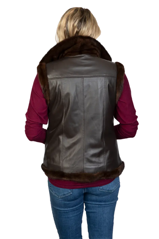 Sheared Vest with Leather Back Reversible to Taffeta
